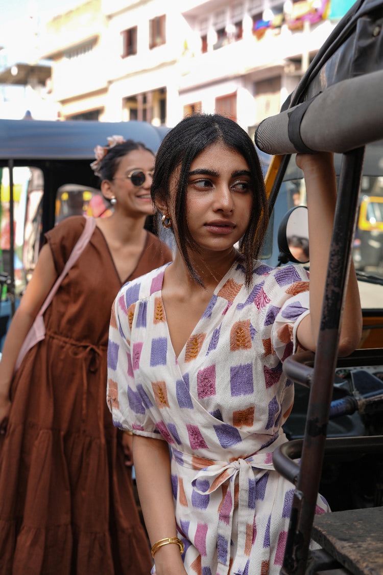 Yashvi fits a UK 4, 168cm tall, and wearing a Wray Size 1