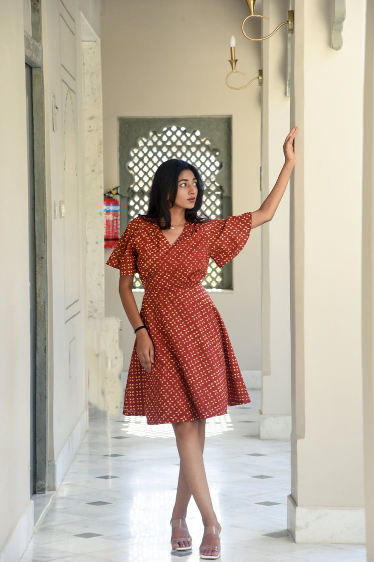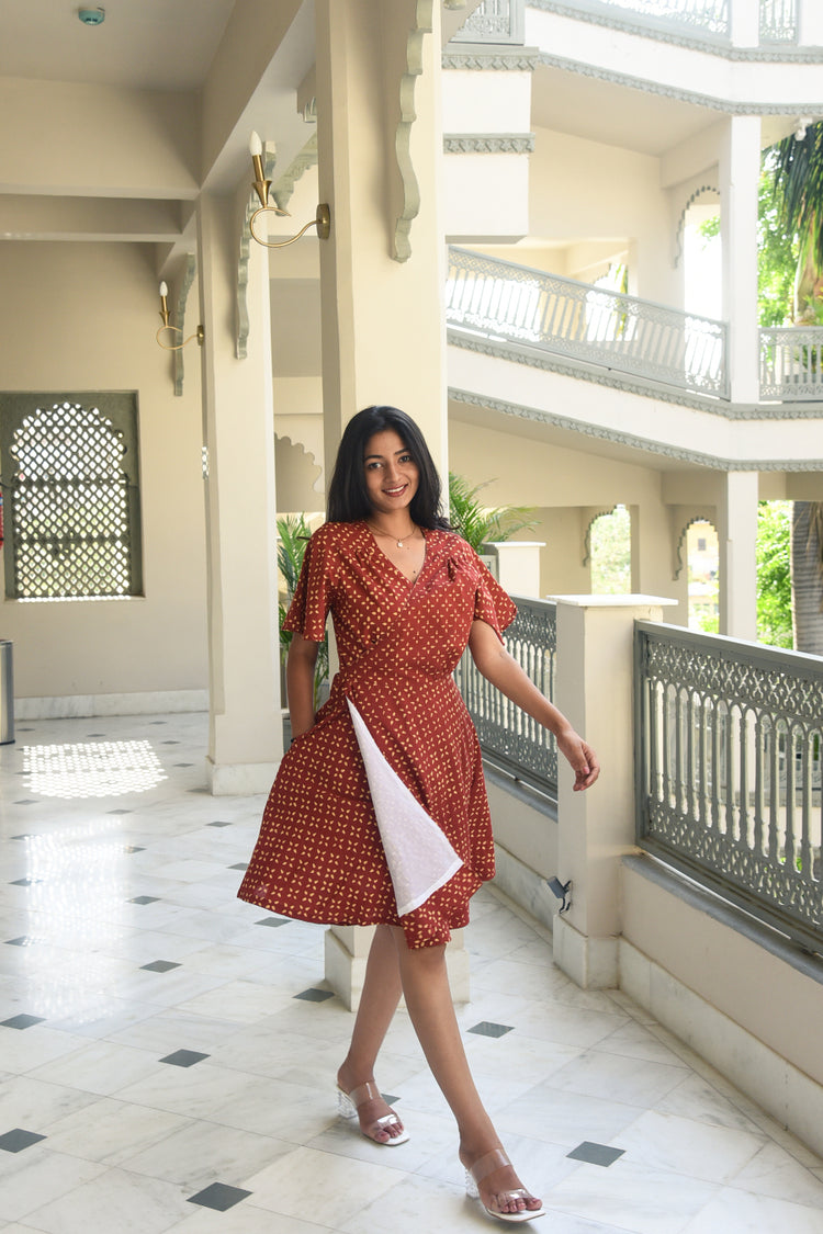 A short and sweet wrap with a flared skirt and designed with gathers on its bodice, allowing for extra coverage to those who prefer a higher neckline.