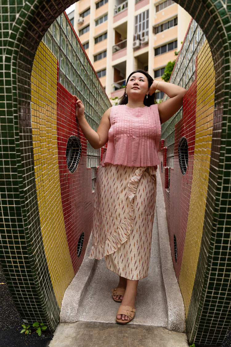 The Meera skirt adds a fresh twist to the classic wrap style with a frilled side hem, infusing it with a touch of feminine playfulness.
