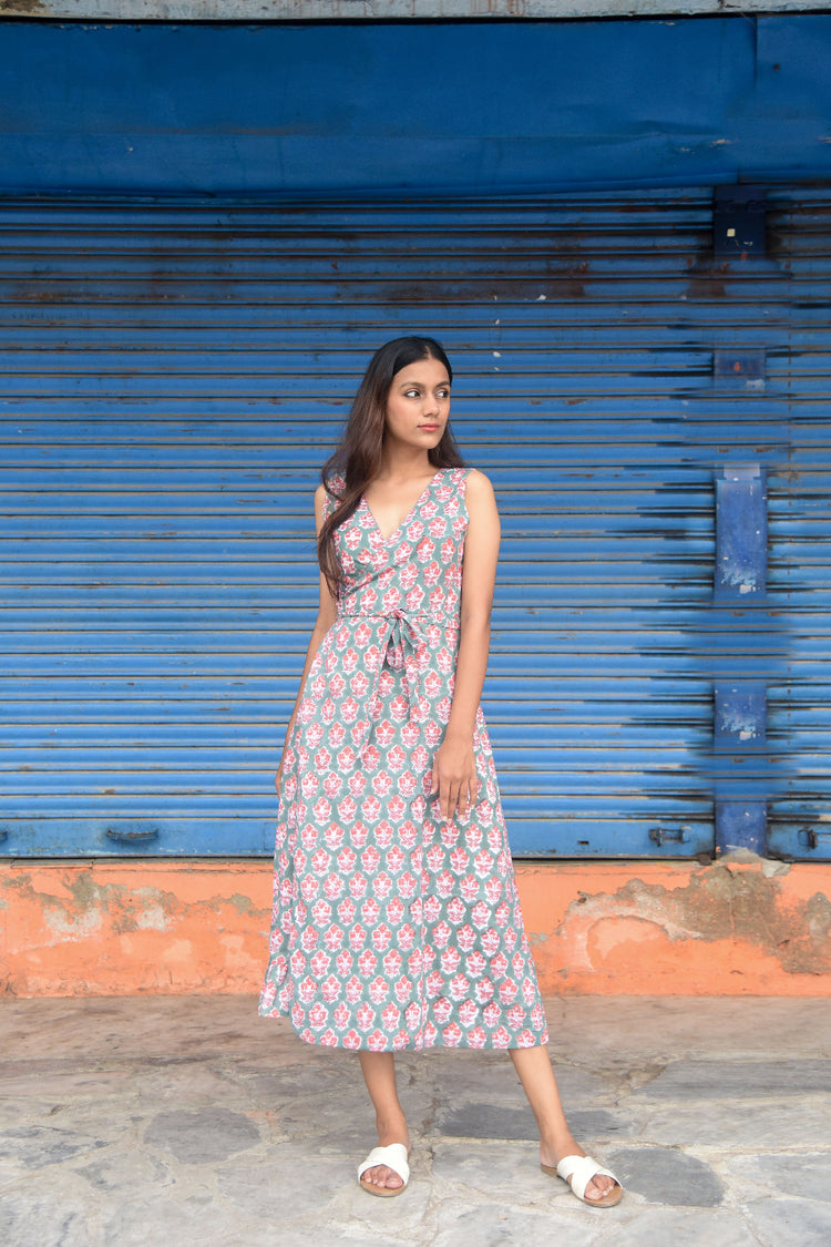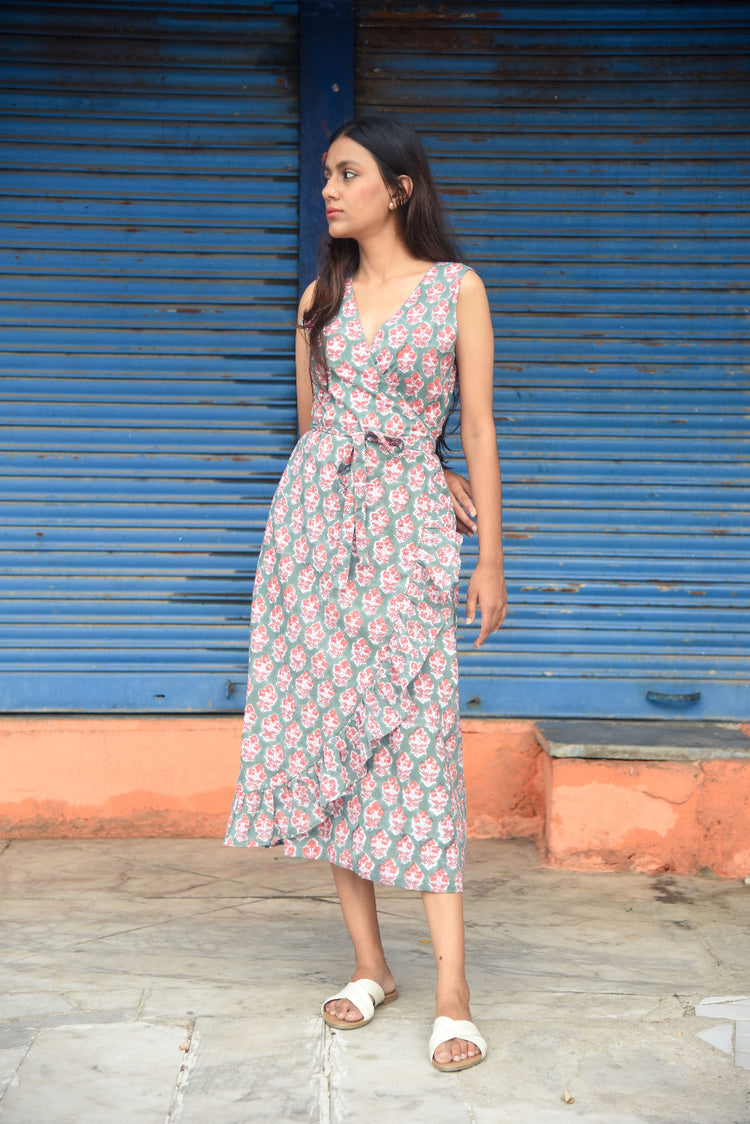 A spin on our Sienna sleeveless wrap dress, Thalia has a playful frilled edge on one side that can be styled featured in front, or hidden behind the straight skirt.