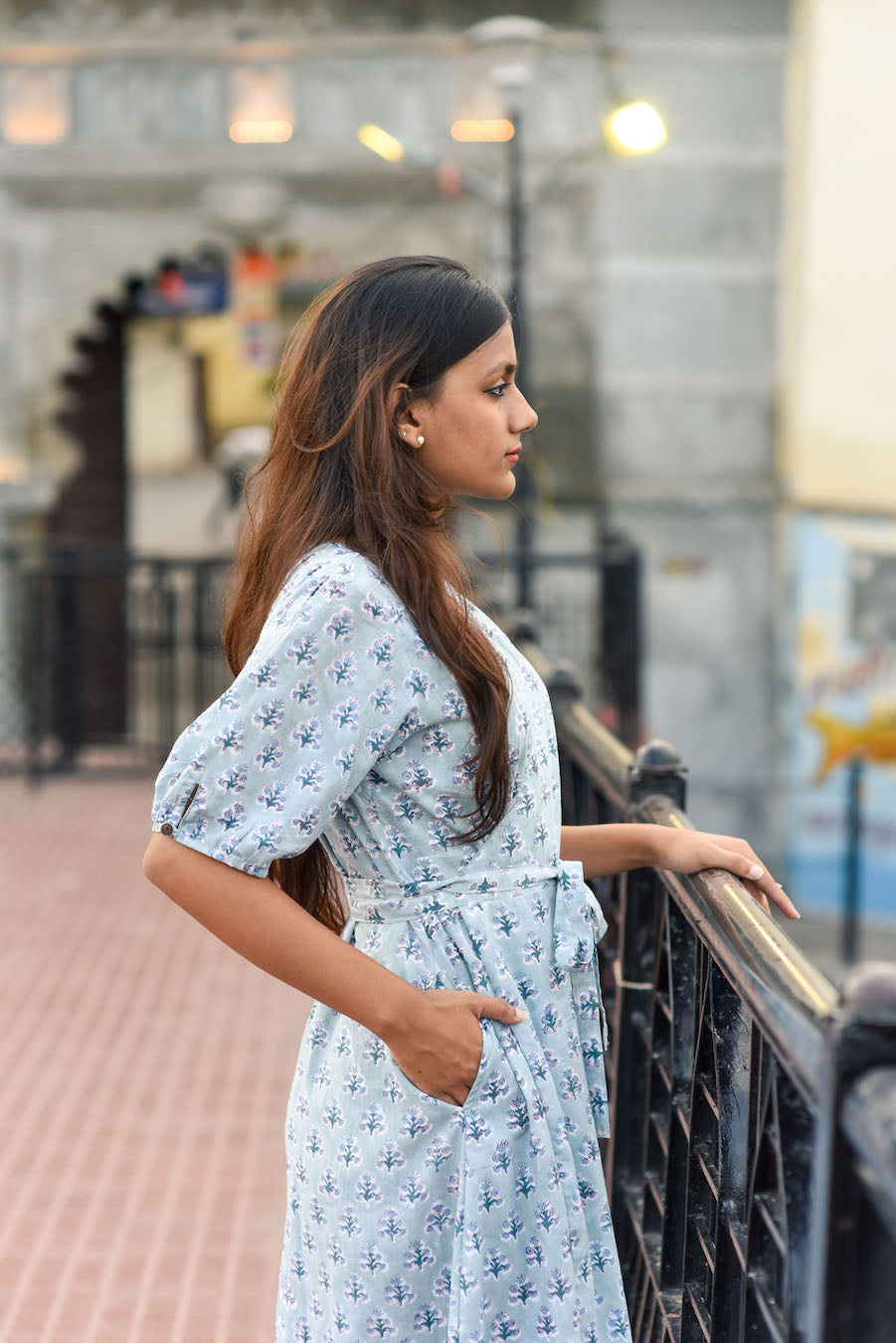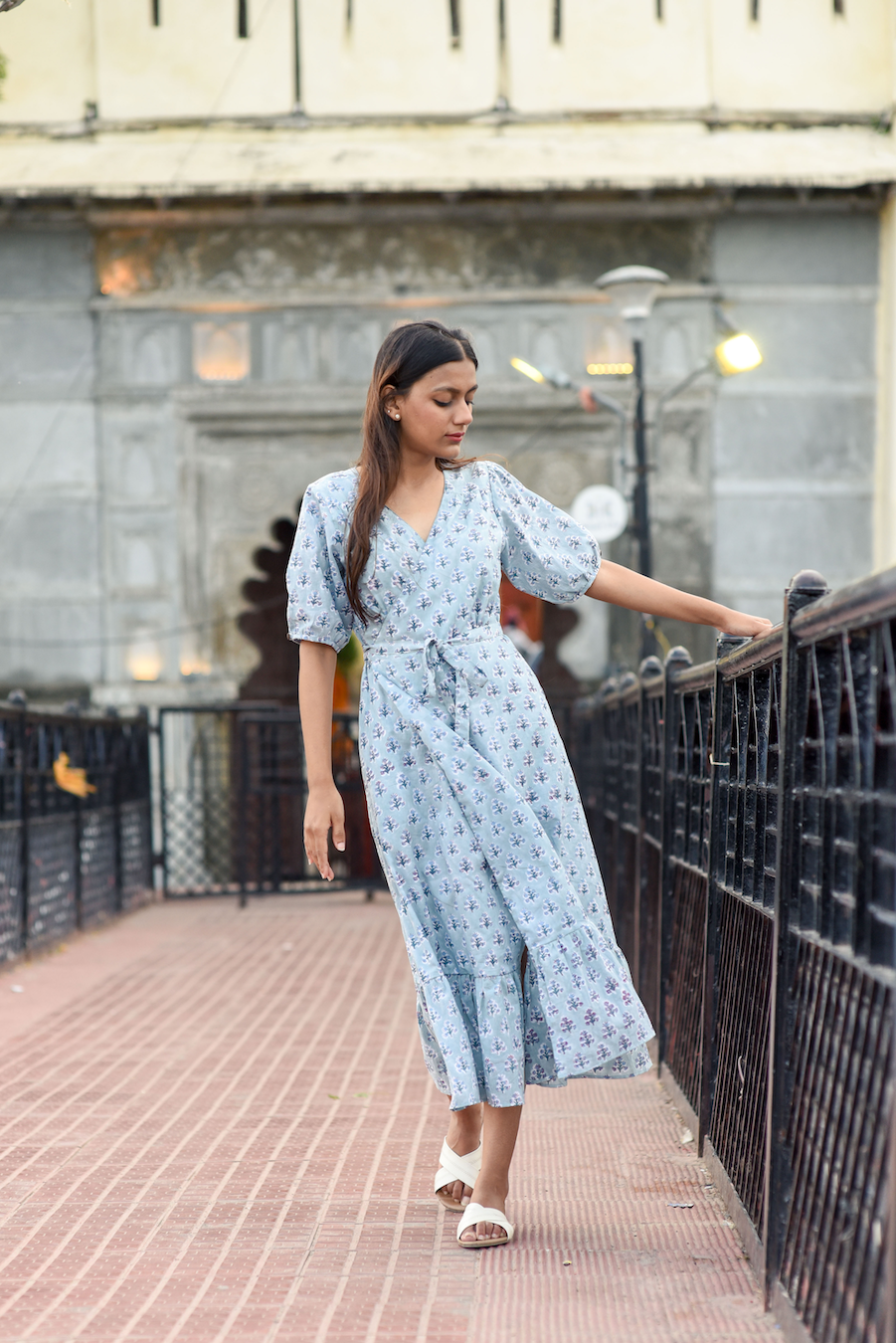 Ava is a chic wrap dress that features romantic half sleeves with button closures and a charming ruffled hem. Ava has also been designed with gathers on its bodice, allowing for extra coverage to those who prefer a higher neckline.