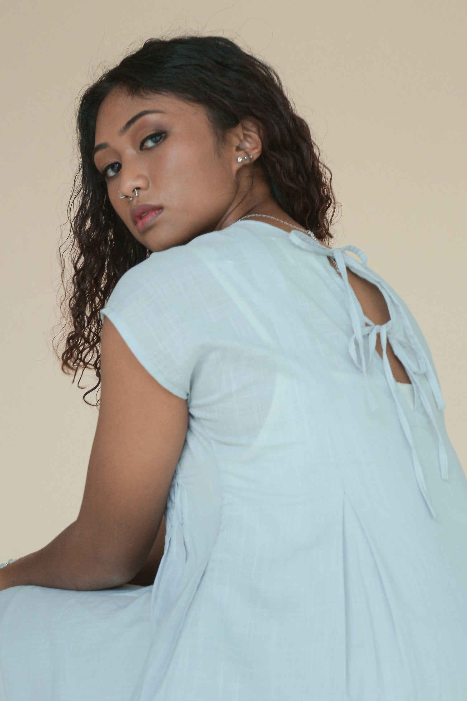 Danika is a labor of love. Taking inspiration from the simple t-shirt dress, we've added some of our favourite details: hand smocked pleated panels and bow tie closures at the back.