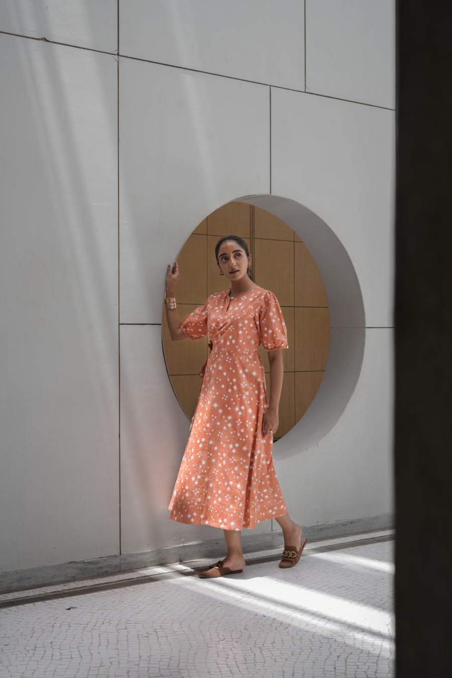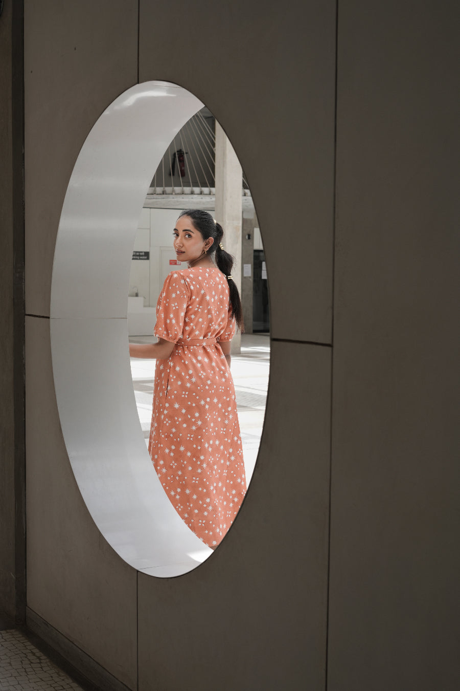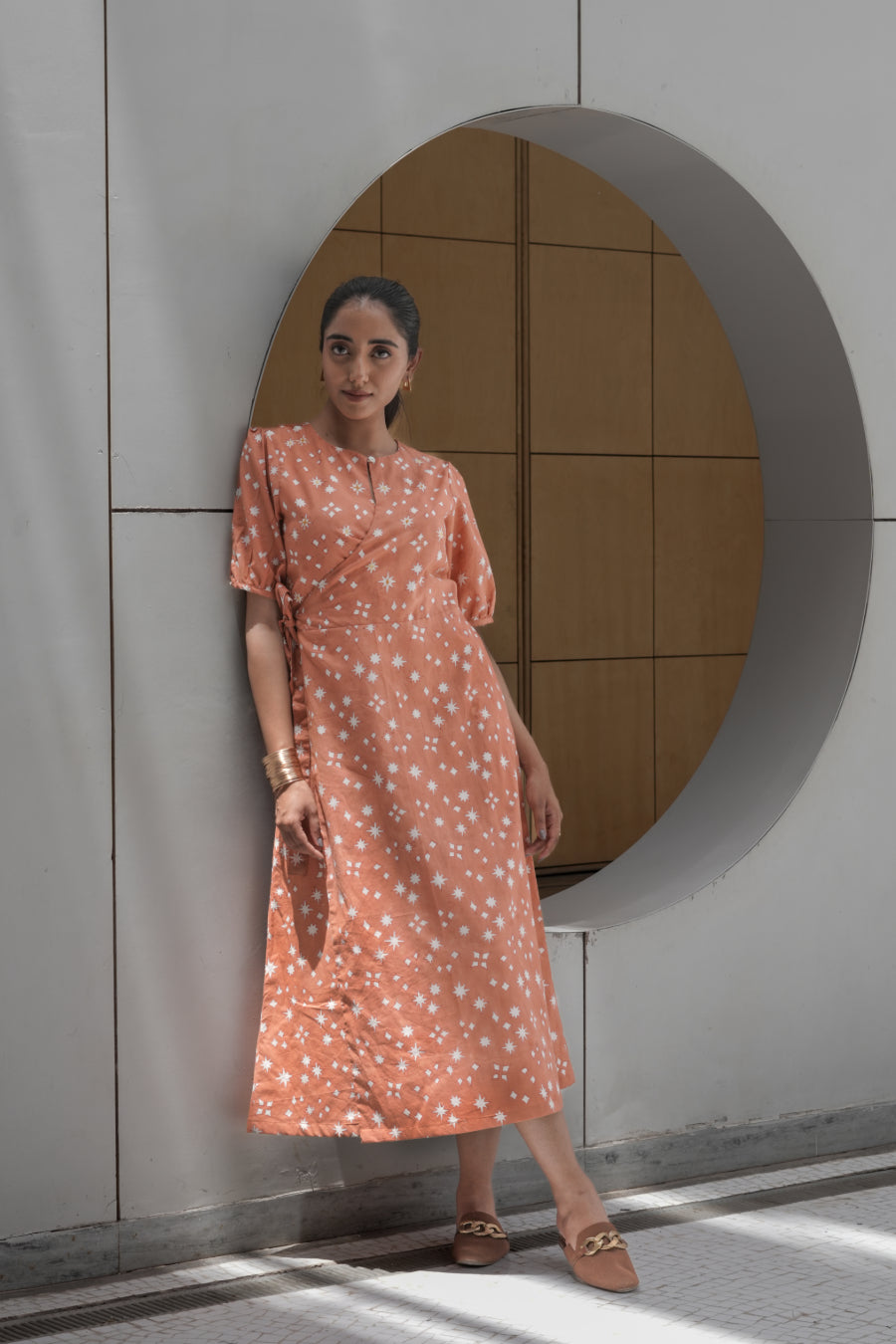 The Isha Wrap Dress opts for a higher neckline instead of the familiar v neckline seen in many wrap dresses. Finished with half sleeves and a shell button at the collar that can be fastened for extra coverage or left open for a more laid-back look.