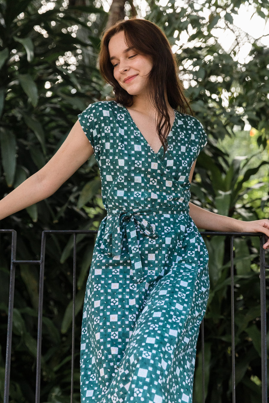 Fitting tip: This one's for the lefties too: the wrap can be tied over right and over left. Wrap the waist ties loosely behind, or cinch tightly for front bows.