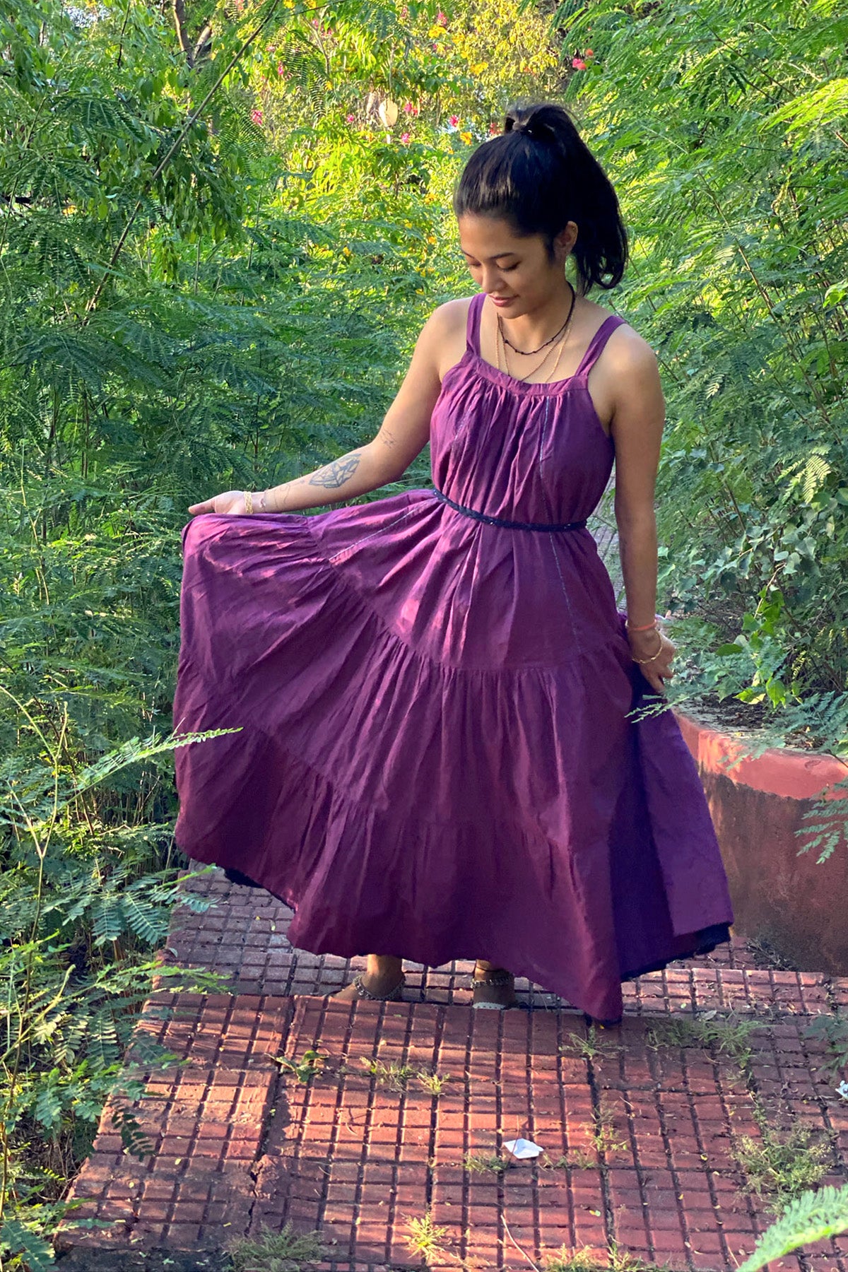 In an effort to go towards zero waste, we've made a few of these maxis in leftover bandej fabric from our first collection! You can wear it in the special hand tied and hand dyed navy, or flip it inside out for a subtle dual toned purple Mangalgiri. The Zuri's got the typical Wray magic in the details: a pocket on each side, a braided belt, and tricolor hand embroidery.