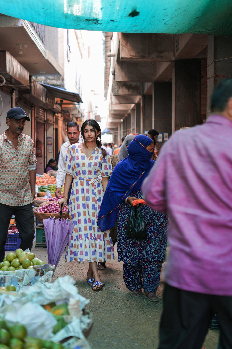 Yashvi fits a UK 4, 168cm tall, and wearing a Wray Size 1