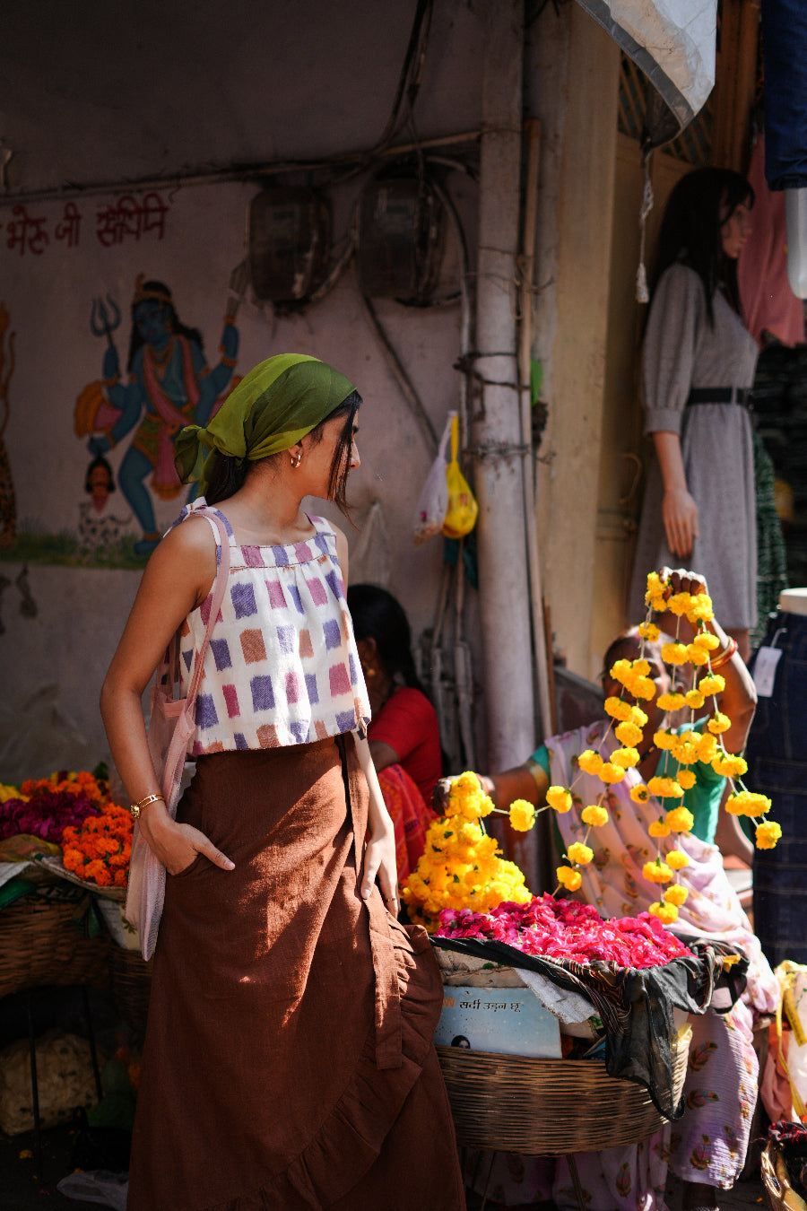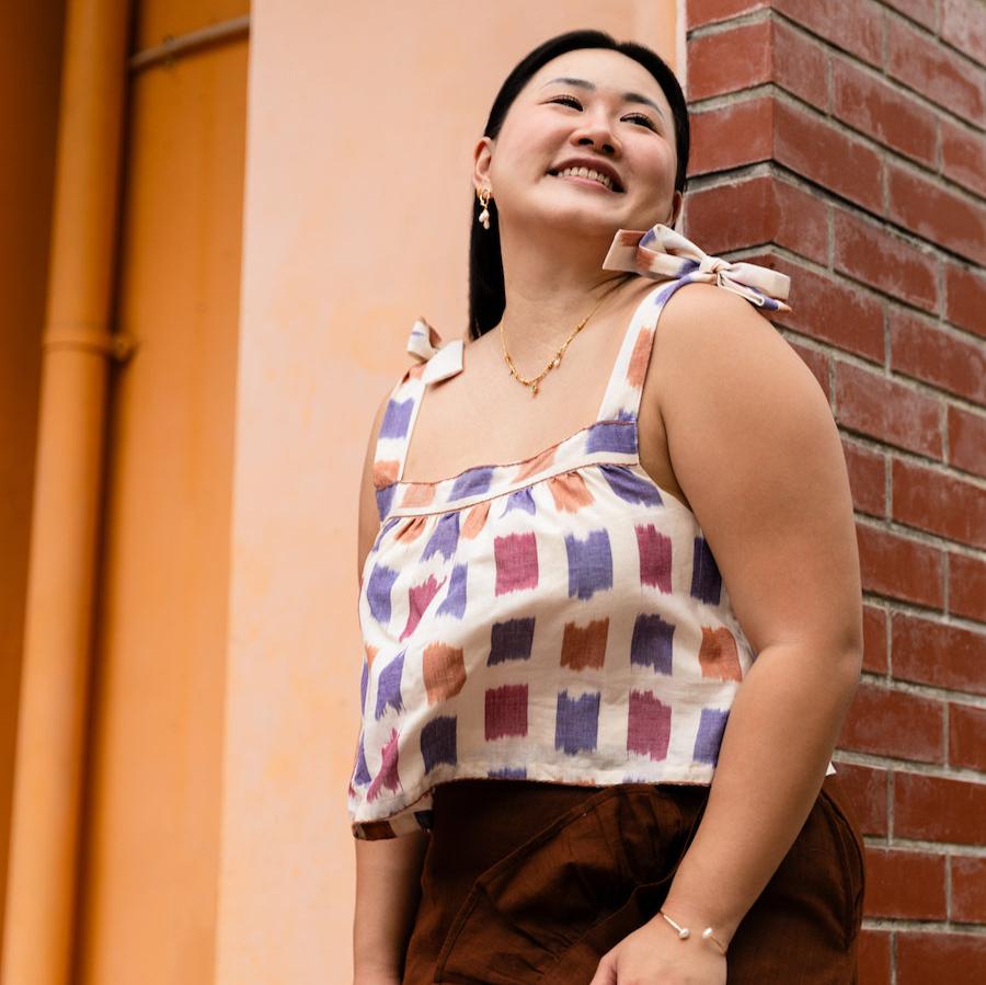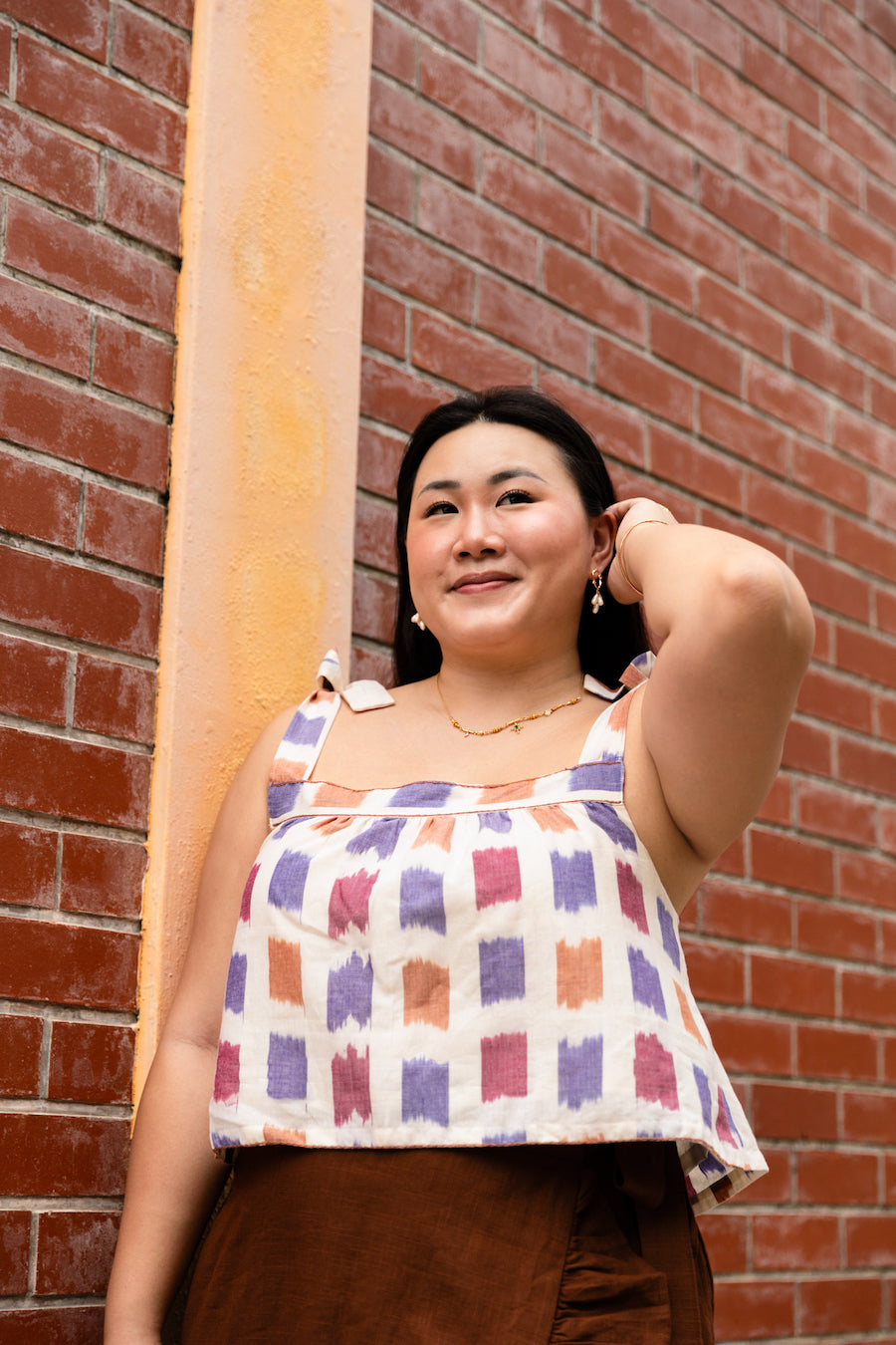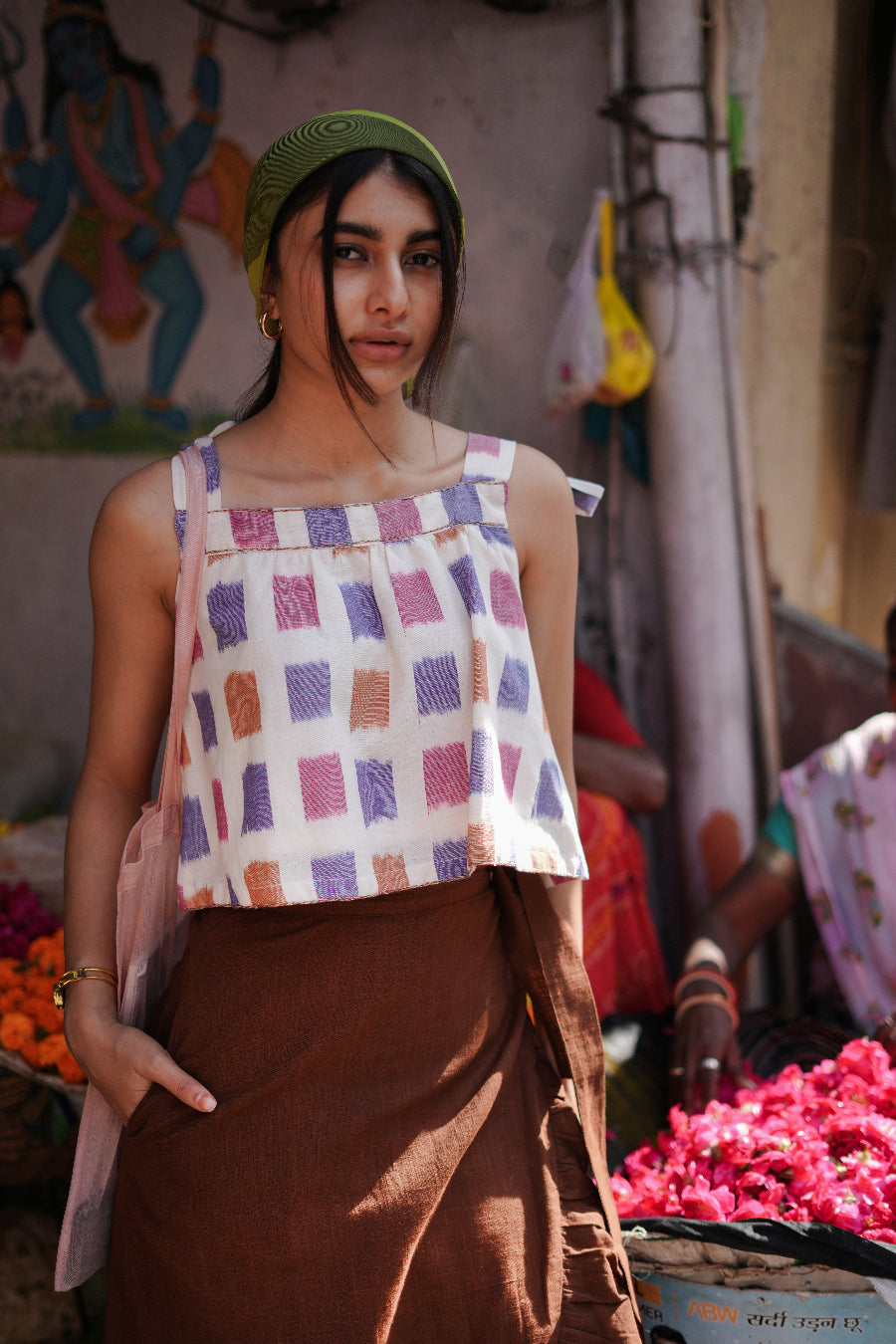 The free-flowing cut of our Maya Top, with its classic square neckline and ribbon tie straps, creates a versatile piece that strikes the perfect balance between elegance and playfulness, giving you the freedom to dress up or keep it casual.