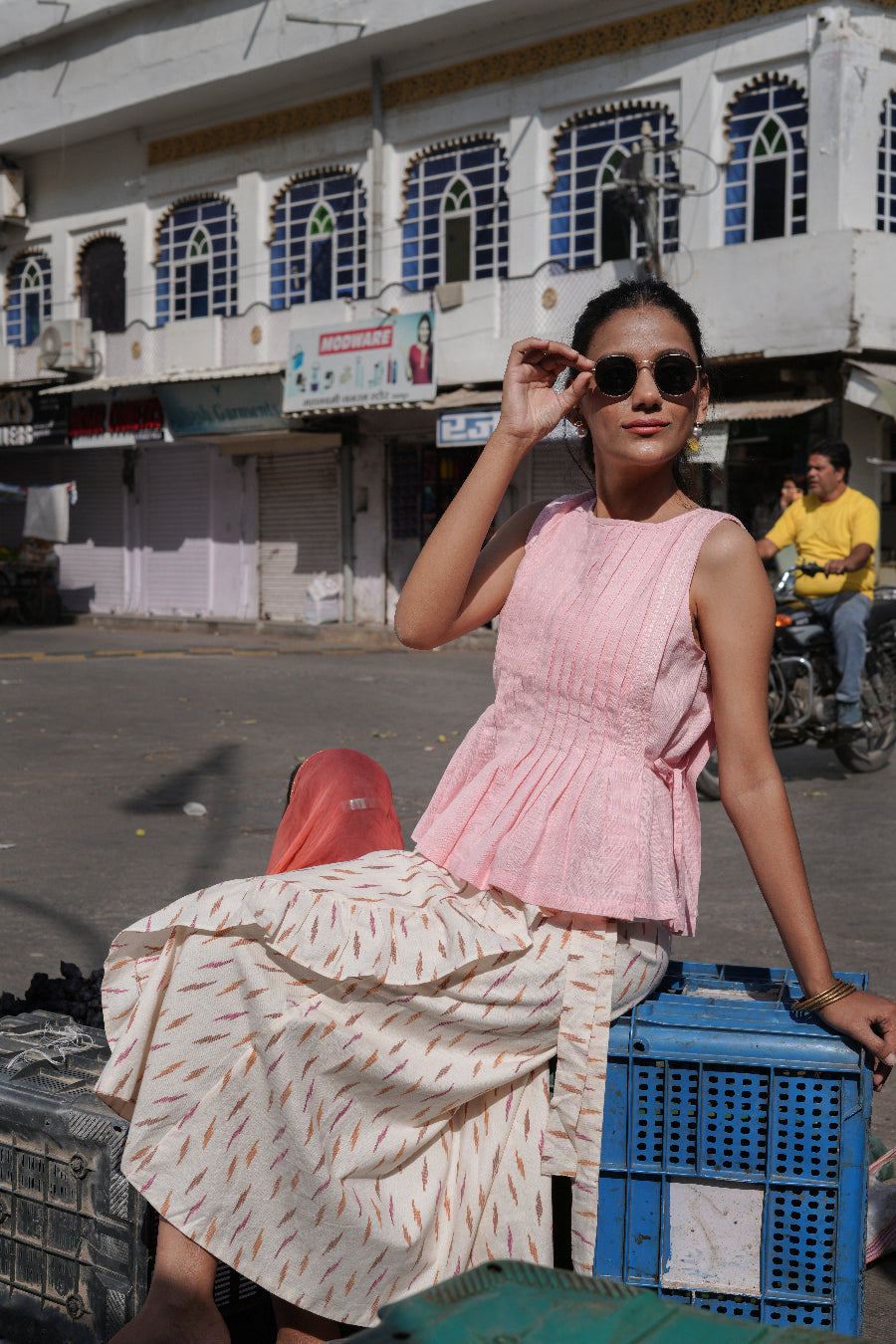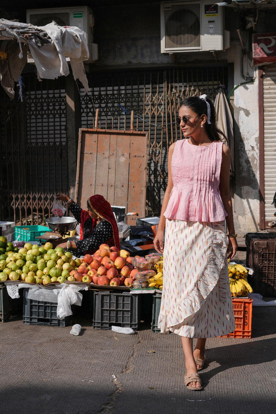 The Meera skirt adds a fresh twist to the classic wrap style with a frilled side hem, infusing it with a touch of feminine playfulness.