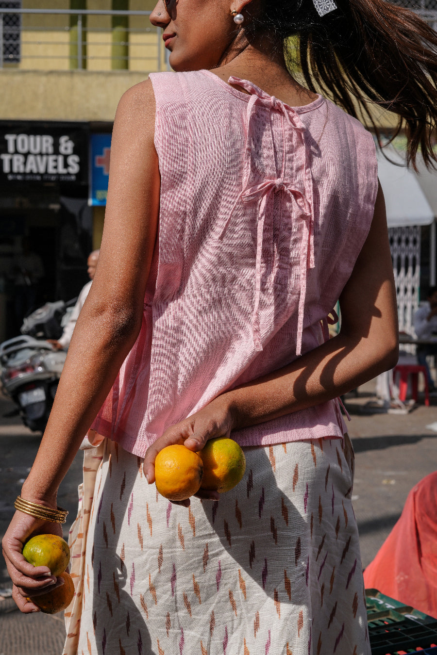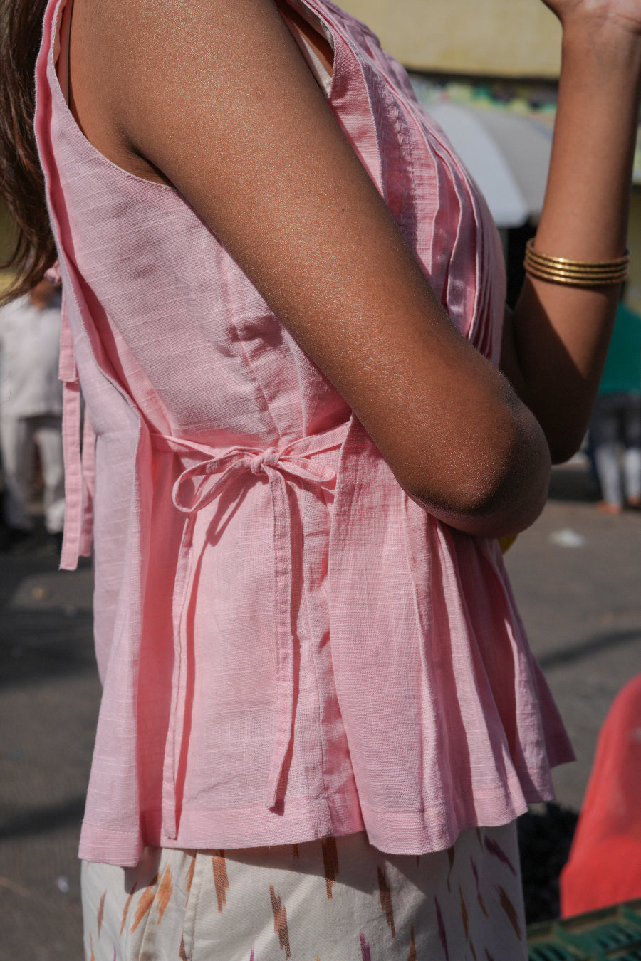 The Rosa Top features intricate pleat detailing, subtle but detailed hand embroidery along the bodice, and waist ties to style as you like.