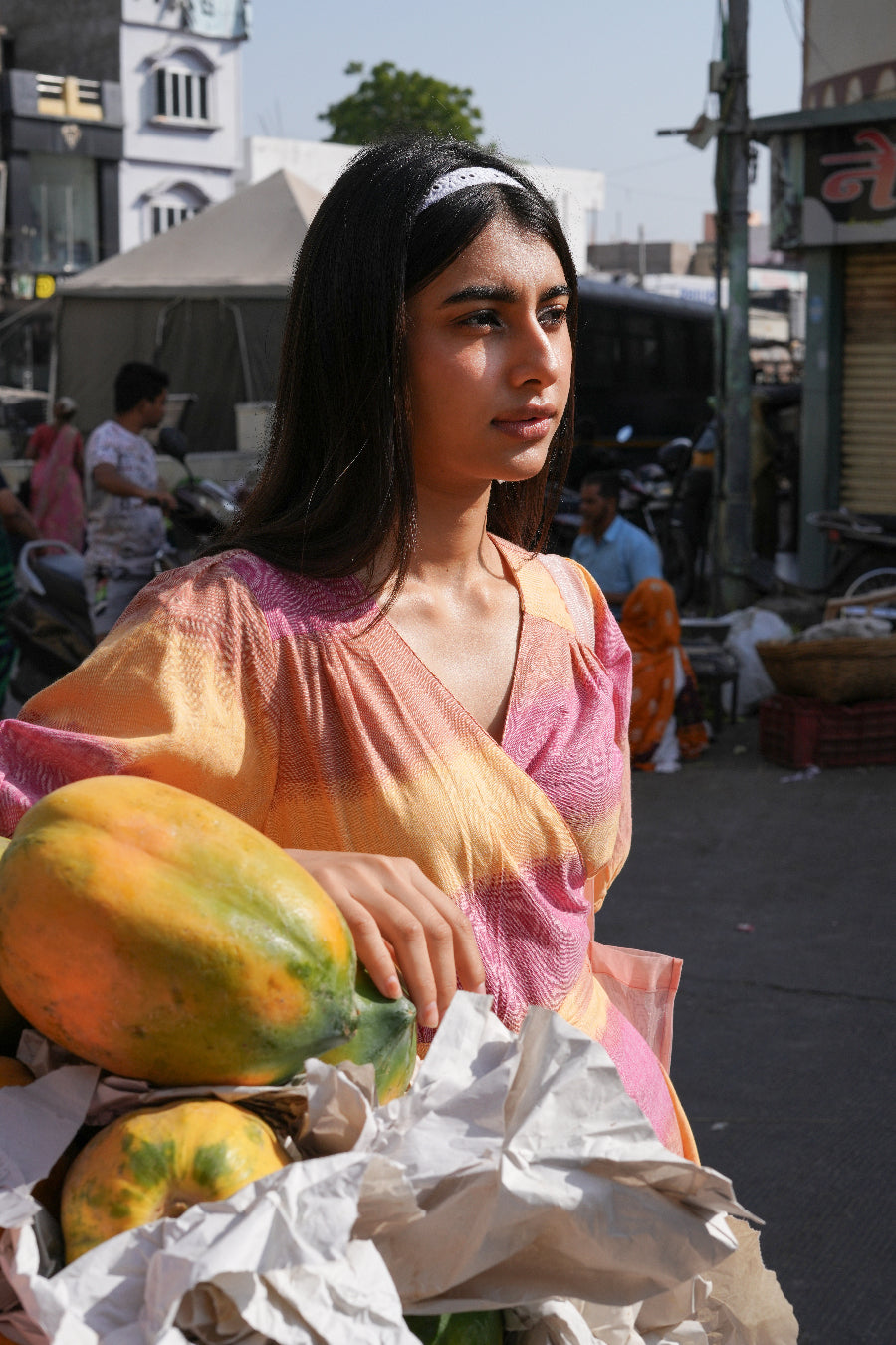 Yashvi fits a UK 4, 168cm tall, and wearing a Wray Size 1