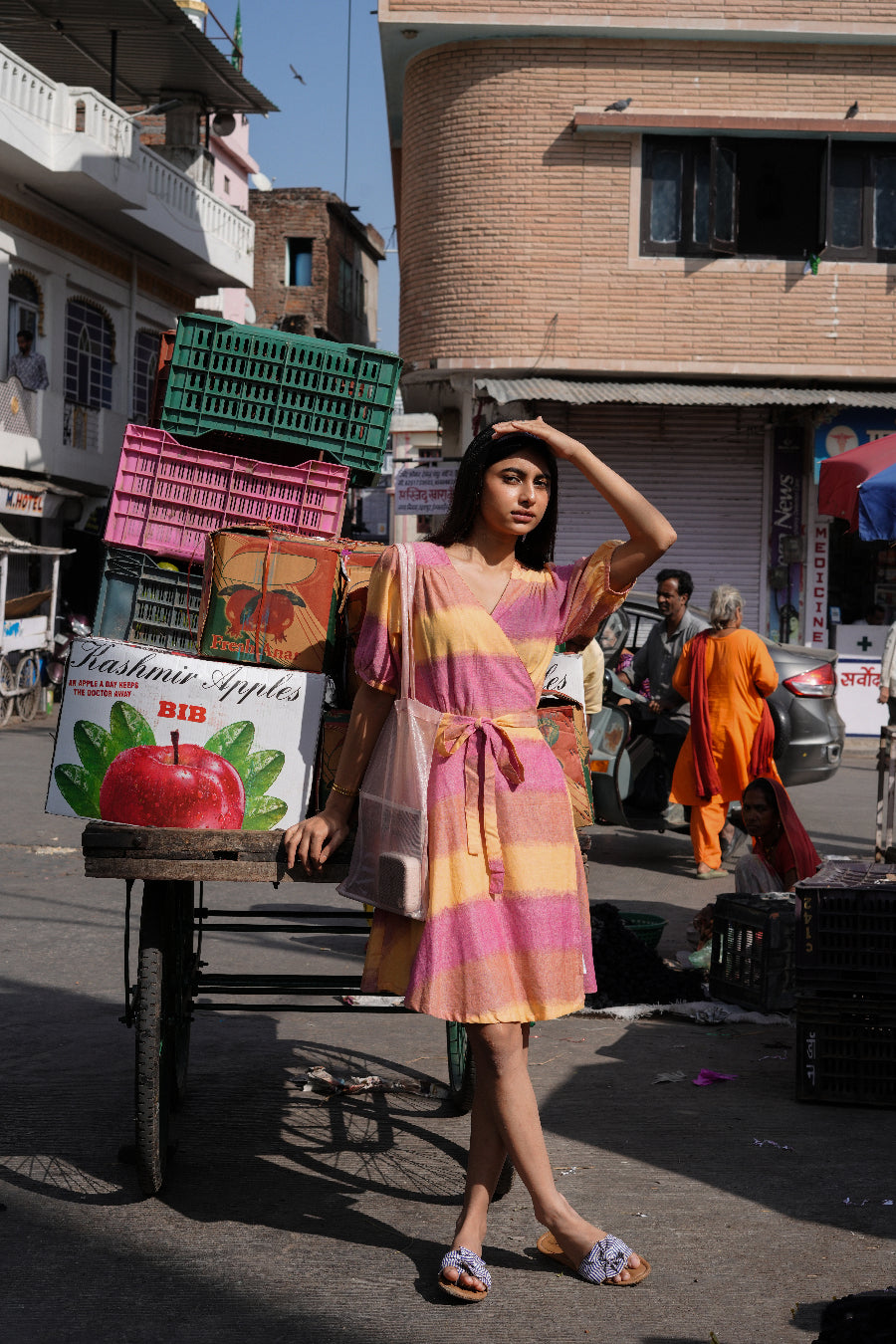 Zira is a playful yet elegant knee-length wrap dress featuring sweet half sleeves with button closures and subtle shoulder gathers that allow extra coverage for those who prefer a higher neckline.